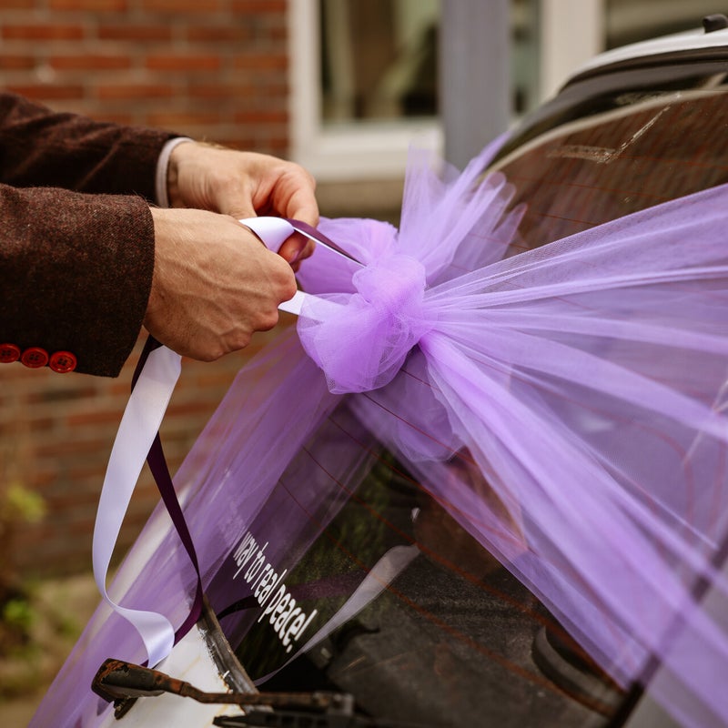 Met het boeket; zelfgemaakt van heide, gipskruid en lavendel.